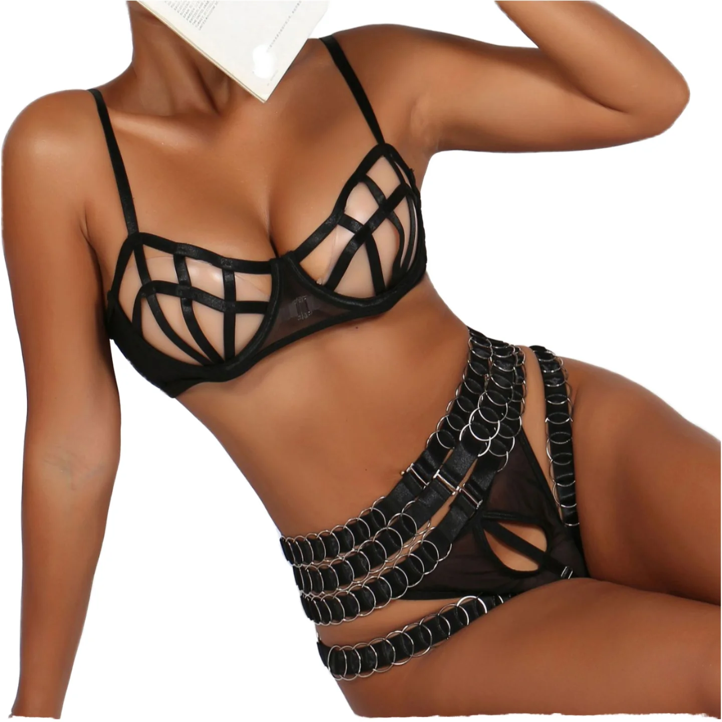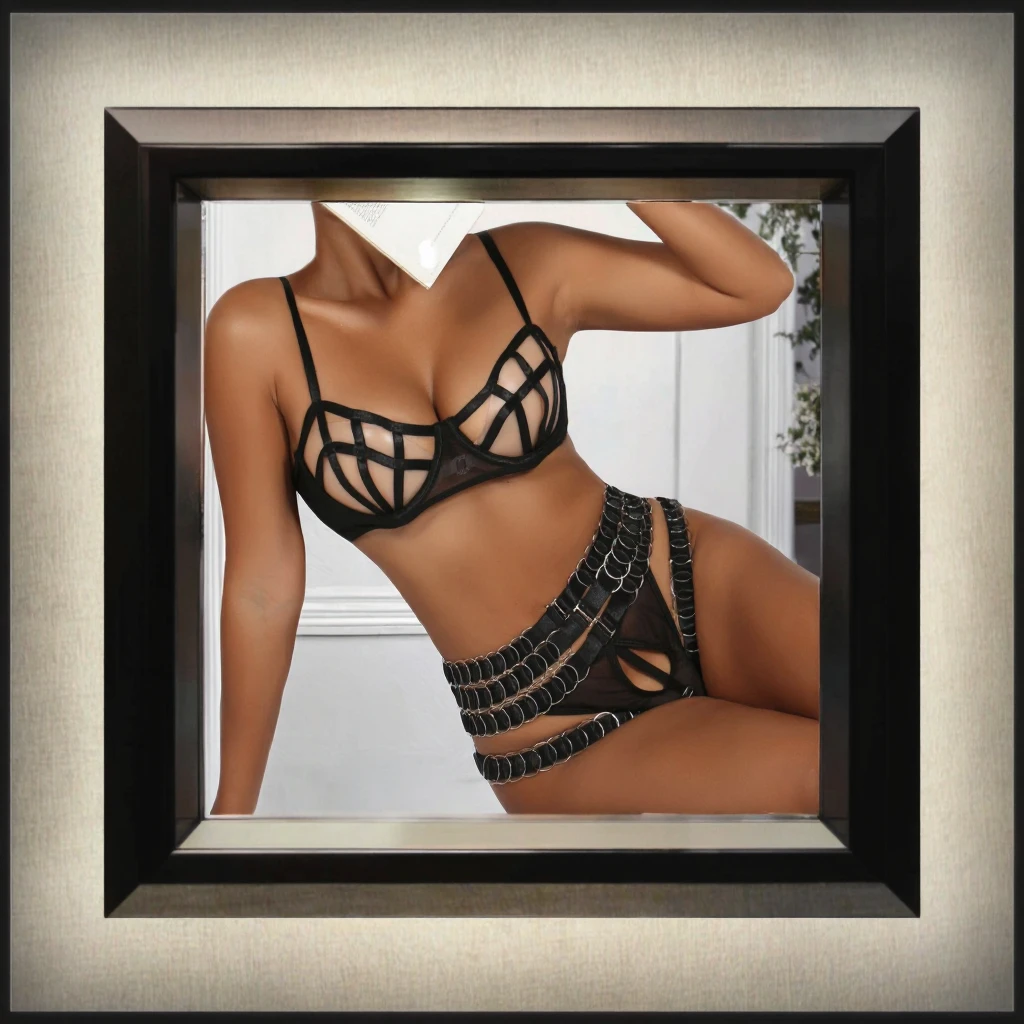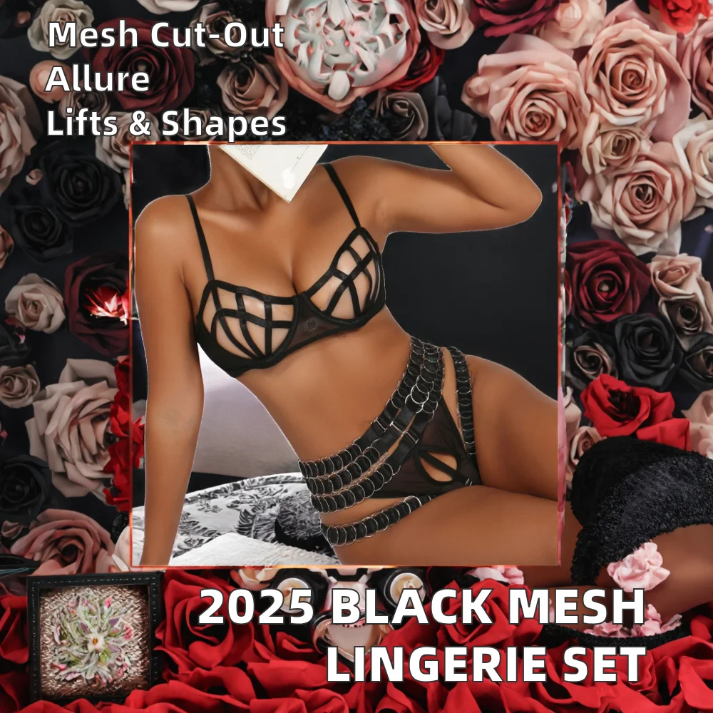 Fashion Black 2026 New Sexy Breathable Eco-Friendly Mesh Hollow See Push Steel Ring Embroidery 4pcs Set Lingerie Gloves Women